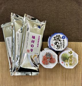 【ギフト】味付海苔と佃煮セットB 2700円 味付海苔と佃煮セットB (shintsubo03) 販売価格¥2,700在庫状態 : 在庫有り(賞味期限:海苔佃煮・製造日より200日 味付海苔・2027年6月3日) ギフトをご希望の場合はのし・包装・紙袋などをカートにお入れください。 セット内容:磯のり青、梅のり、ゆず胡椒のり、味のり3袋 対象商品:つぼタイプの佃煮は入れ替え可。 数量