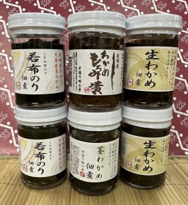 セット内容:茎わかめ佃煮150g・生わかめ佃煮150g2個・わかめもろみ漬150g・若布のり150g2個