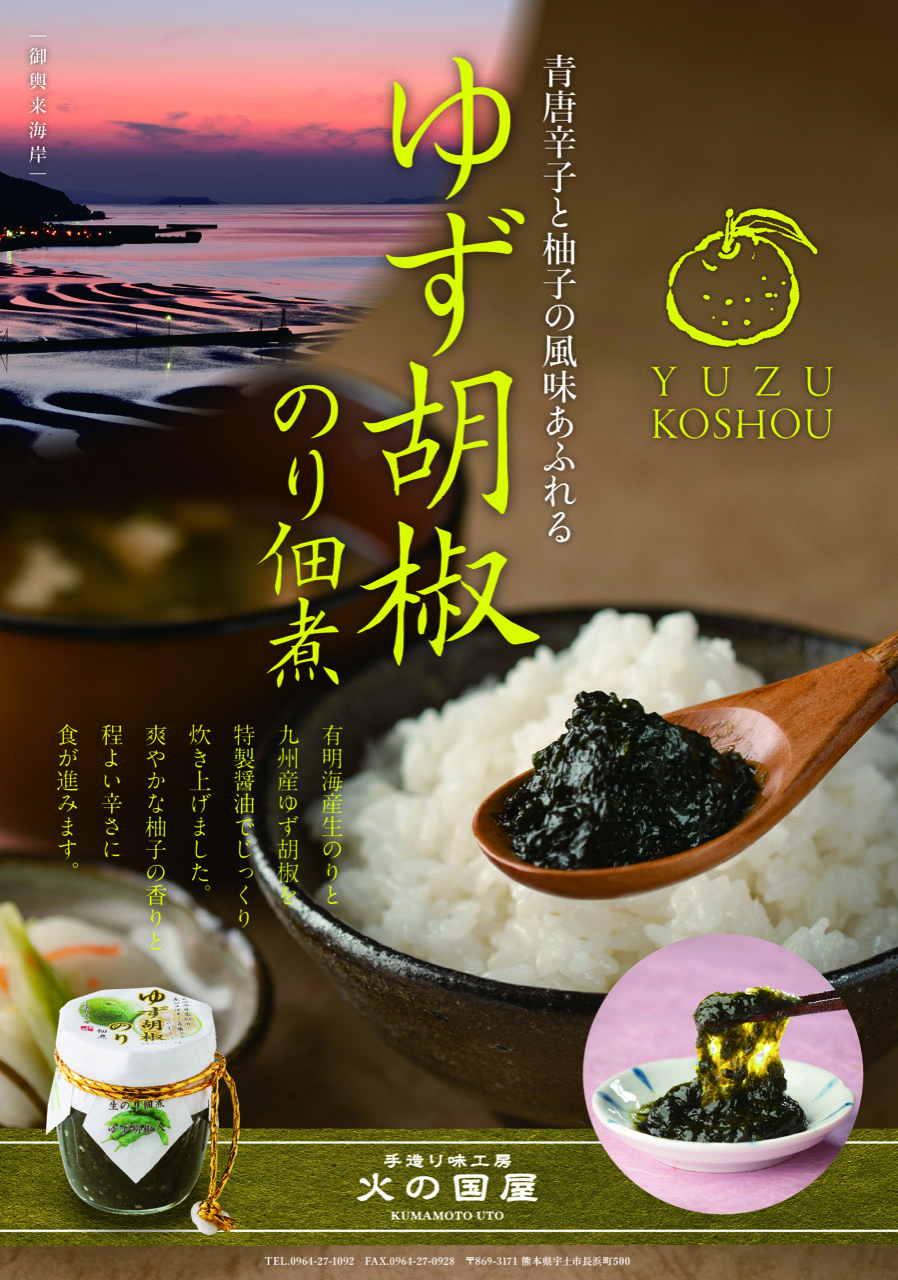 ゆず胡椒のり170g 600円【人気商品】 ゆず胡椒のり (yuzu002) 販売価格¥600在庫状態 : 在庫有り 有明海の生のりと九州産のゆず胡椒を特製醤油でじっくりと炊き上げました。ゆずの爽やかな香りと胡椒(青唐辛子)のピリッとした辛さが食欲をそそります。温かいご飯はもちろんの事、冷奴や納豆、素麺、うどんの薬味にどうぞお召し上がり下さい。 内容量:170グラム 賞味期限:製造日より200日 数量