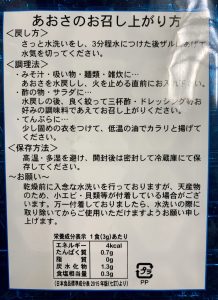 天草産あおさ20g 500円 天草産あおさ20g (aosa20) 販売価格¥500在庫状態 : 在庫有り (賞味期限:製造日より180日) 内容量20グラム。 天草産の新鮮なあおさを使用しています。 爽やかな香りと磯の風味。 吸物、味噌汁の椀だね その他色々なお料理に ご使用いただけます。 ご注意 あおさは必ず水洗いしてからご使用下さい。 砂、貝殻などが付着している場合があります。 調理例(味噌汁) 養殖風景1 養殖風景2 数量